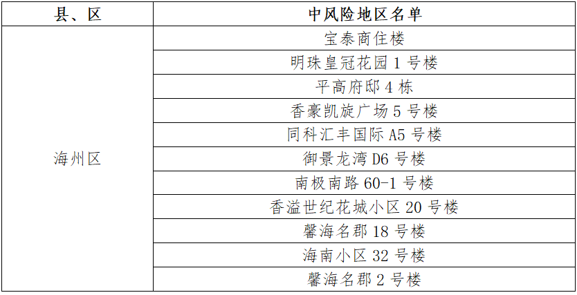 根據(jù)國務(wù)院聯(lián)防聯(lián)控機制有關(guān)規(guī)定,經(jīng)市指揮部研究決定,自發(fā)布之日起,對我市部分區(qū)域疫情風(fēng)險等級進行調(diào)整:海州區(qū)同科匯豐國際C10號樓、紫金公館3號樓、興業(yè)時代花園B6號樓、興業(yè)時代花園C6號樓、九龍城市樂園77號樓、明珠皇冠花園20號樓、華潤公寓、雙龍村澗西隊65號、眾興華庭10號樓、壹品國際C區(qū)、香溢世紀花城小區(qū)2號樓、明珠皇冠花園11號樓、小學(xué)路11-1號樓、兆隆城市洋房A號樓、振興小區(qū)2號樓、易居公館4號樓、浦潤花園4號樓由中風(fēng)險地區(qū)調(diào)整為低風(fēng)險地區(qū)。其他地區(qū)風(fēng)險等級不變。調(diào)整后全市現(xiàn)有11個中風(fēng)險地區(qū)。