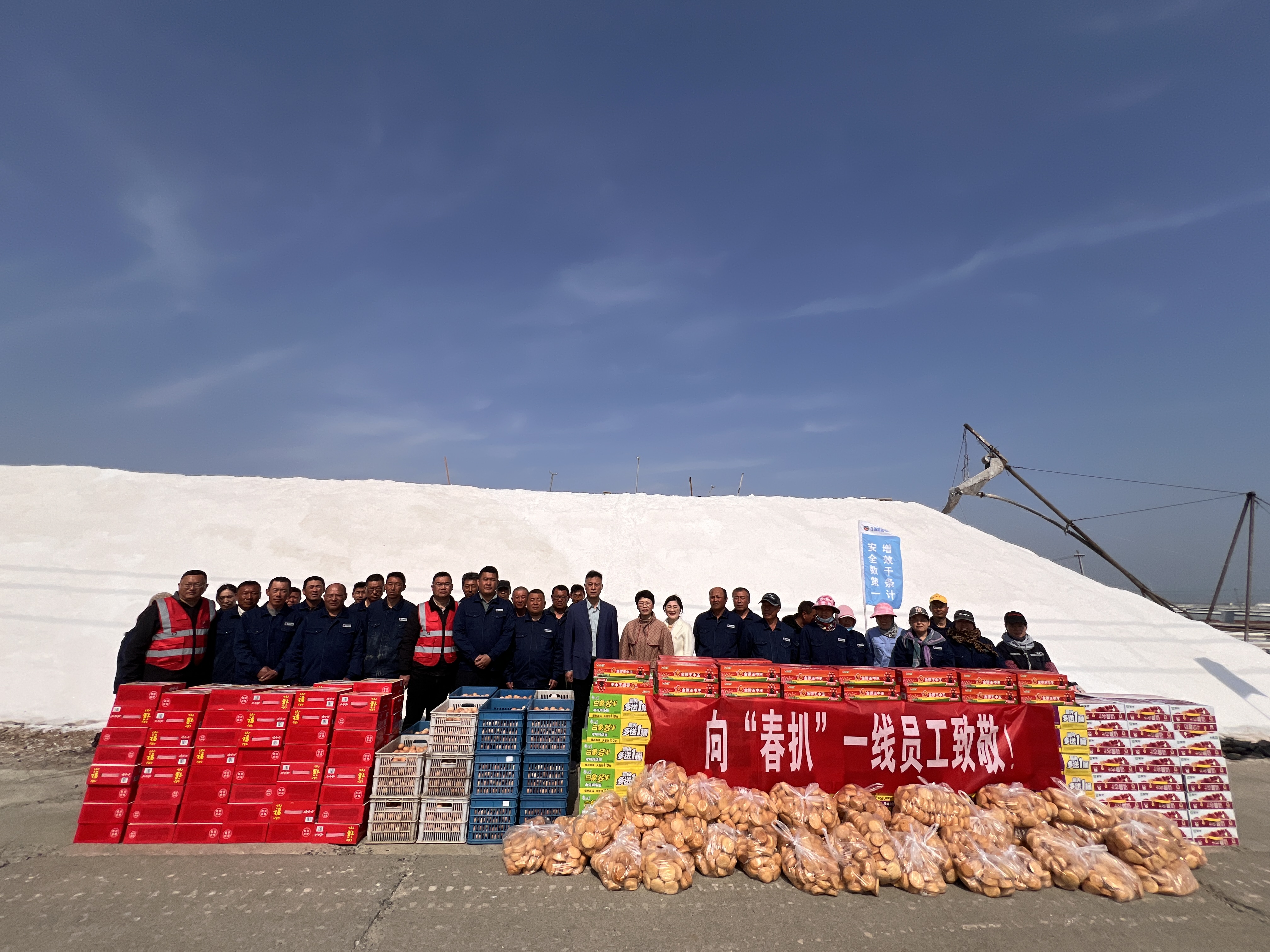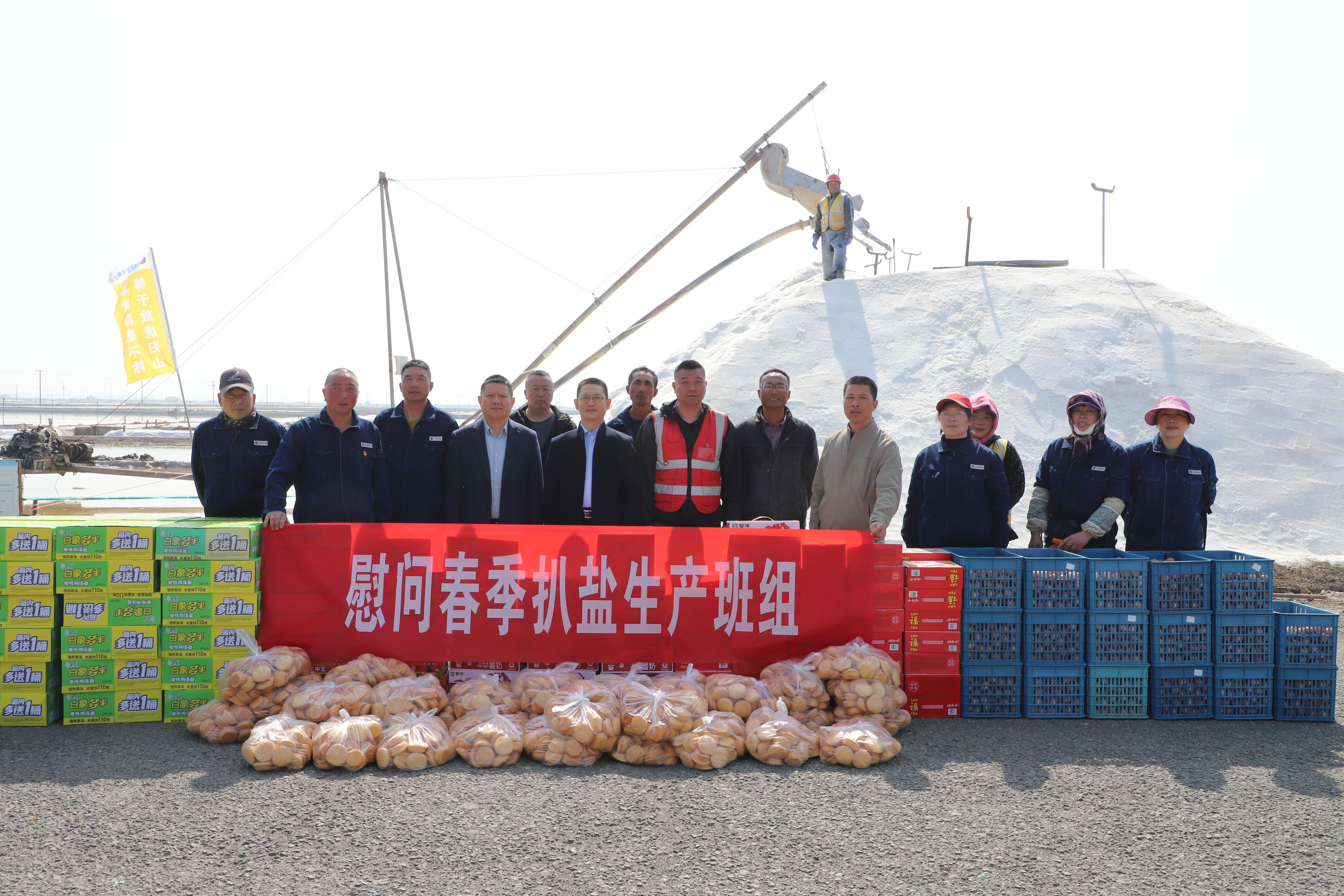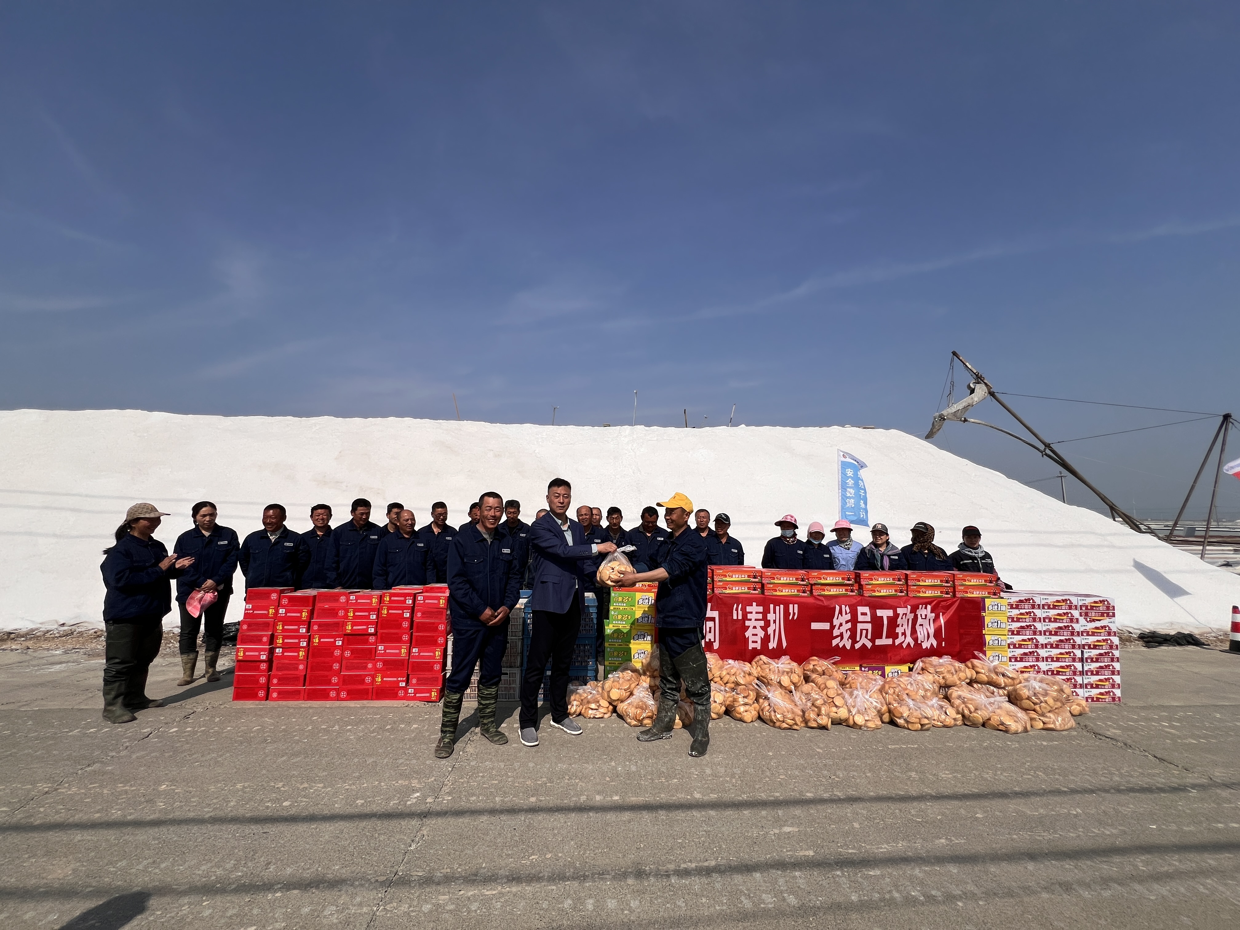 “你們辛苦了,我代表公司來看望大家。”在新河十班與埒南十一班,吳衛(wèi)平與扒鹽現(xiàn)場職工握手問好,感謝他們在過去的一年為日曬制鹽公司的原鹽生產(chǎn)所付出的辛勤努力,叮囑他們一定要落實落細扒鹽生產(chǎn)措施,增強責(zé)任感和警覺性,嚴格執(zhí)行各項規(guī)章制度,切實保障扒鹽期間的安全生產(chǎn),并送上雞蛋、八寶粥、方便面、牛奶等物品。