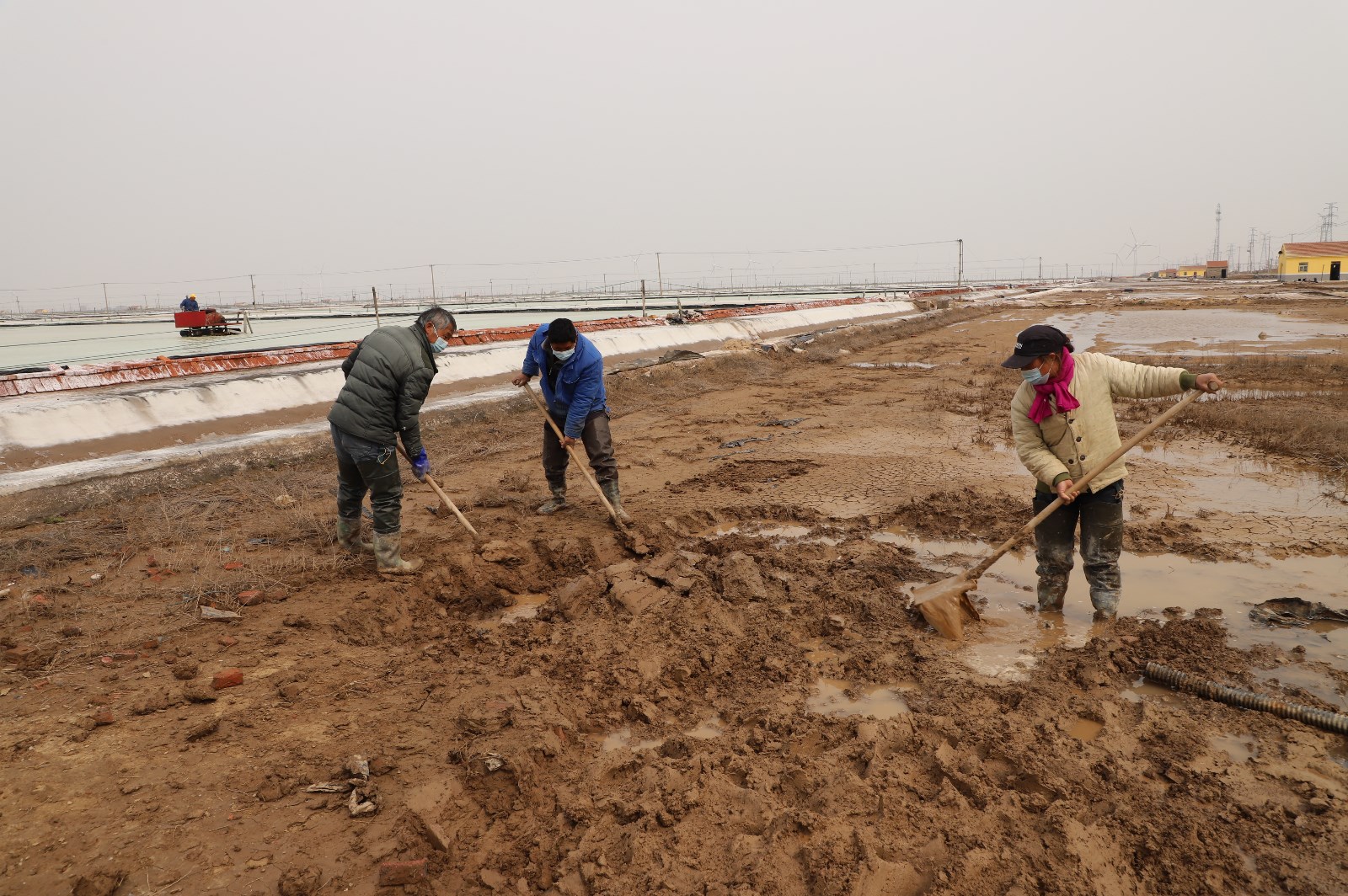 3月28日清晨,在通往日曬制鹽新河、埒南分公司入口處,戴著口罩的工人們依次接受測溫、亮碼、登記,有序進(jìn)入各生產(chǎn)班組。灘頭上,工人們分散作業(yè),忙著修補(bǔ)塑造、整理廩基……無論是從灘頭到塘頭,還是從碼頭到田頭,處處都呈現(xiàn)出熱火朝天、大干快上的場景。