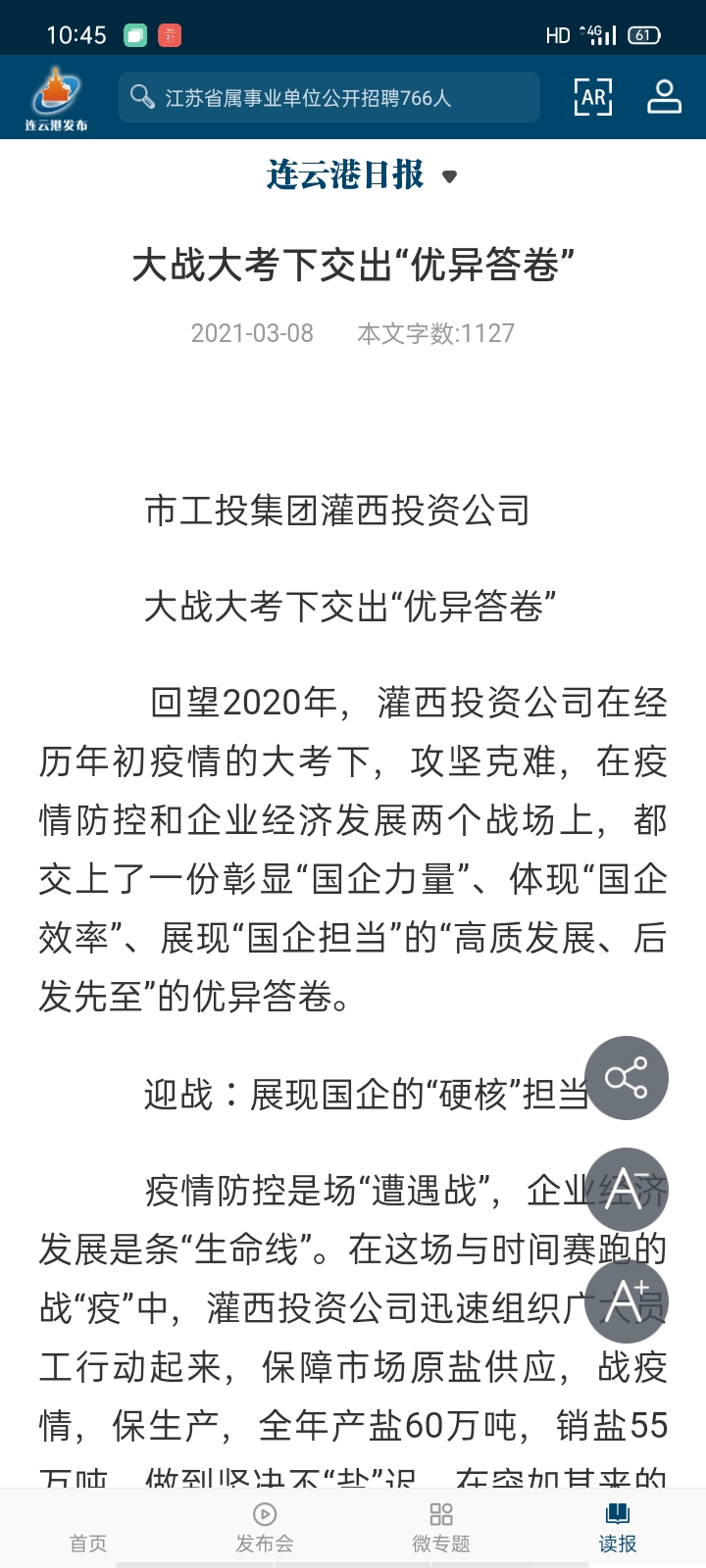 疫情防控是場“遭遇戰(zhàn)”,企業(yè)經濟發(fā)展是條“生命線”。在這場與時間賽跑的戰(zhàn)“疫”中,灌西投資公司迅速組織廣大員工行動起來,保障市場原鹽供應,戰(zhàn)疫情,保生產,全年產鹽60萬噸,銷鹽55萬噸,做到堅決不“鹽”遲。在突如其來的疫情大考面前,通過在“家門口”搭建招聘平臺,“點對點”推送用工信息,為應聘人員“量身”定崗,招聘因疫情管控失業(yè)人員83人,同時為臨港產業(yè)區(qū)輸送轉崗職工70余人,讓因疫情管控還沒有出門打工的灌西社區(qū)本地人員在家門口上班,穩(wěn)住了復工復產的“陣腳”,以“硬核”擔當,護航企業(yè)經濟復蘇。