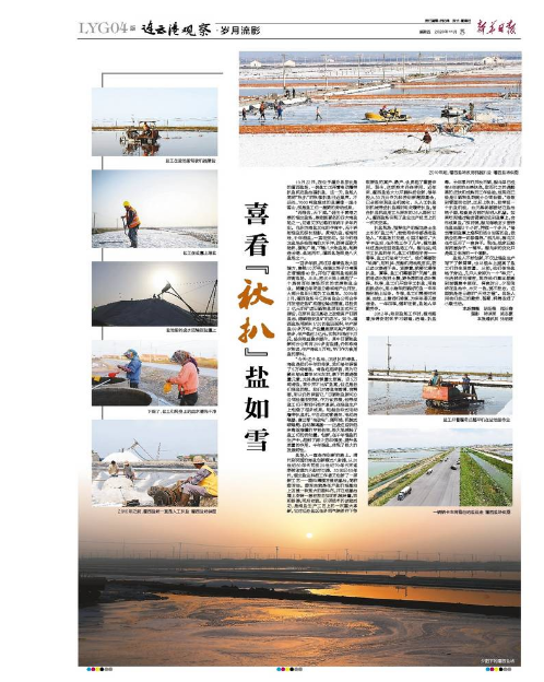 扒鹽現場,指揮生產的程龍是土生土長的“鹽三代”,爸爸和爺爺都是老鹽場人。“和鹽場打交道,心里才踏實。”大學畢業(yè)后,在外地工作了幾年,程龍最終還是決定回到鹽場工作。程龍說,純手工扒鹽的年代,鹽工們都很辛苦——春季,鹽工們迎來“大忙”。他們需要防“地漏”,用石拱、壓割機把池底壓實,防止鹵水滲透下去。緊接著,就要忙春季扒鹽。夏季,鹽工們需要防“天漏”,提前將鹵水放進土塘,避免降雨將鹵水稀釋。秋季,鹽工們開始手工扒鹽,用扁擔挑鹵水,用小推車把曬好的鹽一車車推到船上運走。冬季,鹽工們需要對溝道、池埝、土塘進行修復,為來年春天做準備。一年四季,循環(huán)往復,鹽場人辛勤勞作。