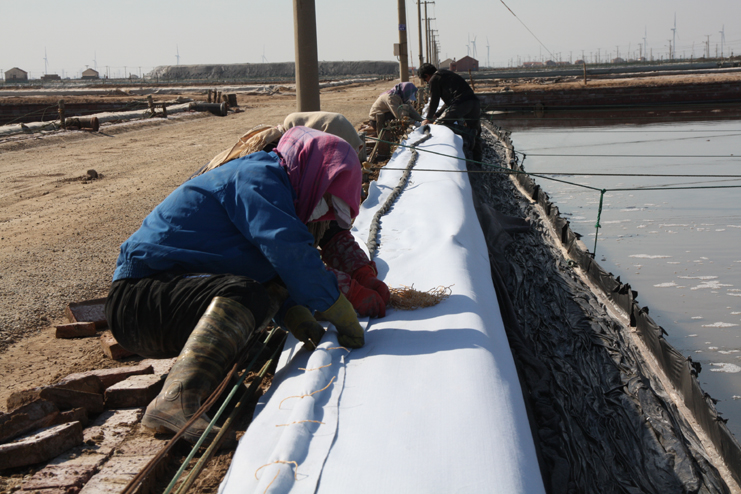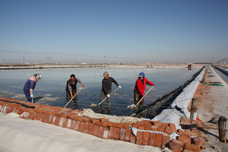 3月14日下午,風(fēng)和日麗,在日曬制鹽公司廣闊的結(jié)晶生產(chǎn)區(qū),潔白的鹽廩、潔白的格堰在陽(yáng)光照耀下,顯得格處醒目,只見(jiàn)工人們有的在扒鹽,有的在破碴,還有的在更換塑布......全公司上下一派大干場(chǎng)景。我們?cè)谛潞又汽}分公司的八班一期生產(chǎn)區(qū),只見(jiàn)工人們兩人一組,蹲在池堰邊,用土工布固化格堰,進(jìn)行灘場(chǎng)亮化,這一片區(qū)域是公司正在建設(shè)的食用原料海鹽生產(chǎn)基地。在一期與二期間的生產(chǎn)路上,我們遇到了該公司經(jīng)理安樹(shù)林,他正從南邊班組一路檢查走來(lái),他告訴我們,自公司職代會(huì)召開(kāi)過(guò)后,新河制鹽分公司通過(guò)支委會(huì)、班組會(huì)迅速傳達(dá)公司職代會(huì)精神,貫徹落實(shí)班組承包方案,對(duì)照全年產(chǎn)鹽55萬(wàn)噸的目標(biāo),做好任務(wù)分解。當(dāng)前鹽業(yè)生產(chǎn)積極做好破碴、活碴、更新塑布等工作,全力推進(jìn)扒鹽工作,今年以來(lái)已經(jīng)扒鹽3.6萬(wàn)噸。