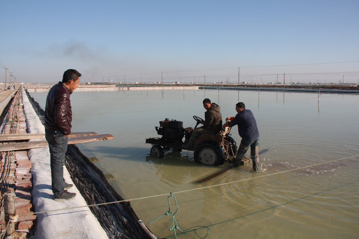 在埒南制鹽分公司的八班,我們看到一名工人正熟練操作著一臺(tái)整平機(jī)械在結(jié)晶池內(nèi)來(lái)回移動(dòng),對(duì)扒過(guò)鹽的格塊進(jìn)行整平,還有幾名工人用鐵锨整平機(jī)械到不了的邊角地帶。由于在廩基上沒(méi)有看到鹽,而結(jié)晶池已扒過(guò)鹽,我們覺(jué)得奇怪,經(jīng)了解,原來(lái)今年新扒鹽已經(jīng)有部分銷售了出去。埒南制鹽分公司經(jīng)理?xiàng)钍乇诰虐嗟臑┥喜榭礄C(jī)械破碴情況,他說(shuō)道:“我們以委員包片形式深入班組貫徹公司職代會(huì)精神,加強(qiáng)形勢(shì)任務(wù)宣傳統(tǒng)一思想,讓員工認(rèn)識(shí)到當(dāng)前原鹽市場(chǎng)回暖行情,鼓舞士氣,振奮精神,全力投入到當(dāng)前春季生產(chǎn)中來(lái)。”