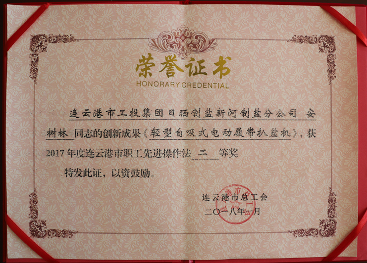 近日,日曬制鹽新河制鹽分公司安樹林同志的創(chuàng)新成果《輕型自吸式電動(dòng)履帶扒鹽機(jī)》,被市總工會(huì)評為2017年度連云港市職工先進(jìn)操作法二等獎(jiǎng),日曬制鹽公司機(jī)電服務(wù)公司王緒華同志的創(chuàng)新成果《唐三零柴油機(jī)傳動(dòng)改為電動(dòng)機(jī)傳動(dòng)帶鹵扒鹽機(jī)組》,被市總工會(huì)評為2017年度連云港市職工先進(jìn)操作法三等獎(jiǎng)。(西工)