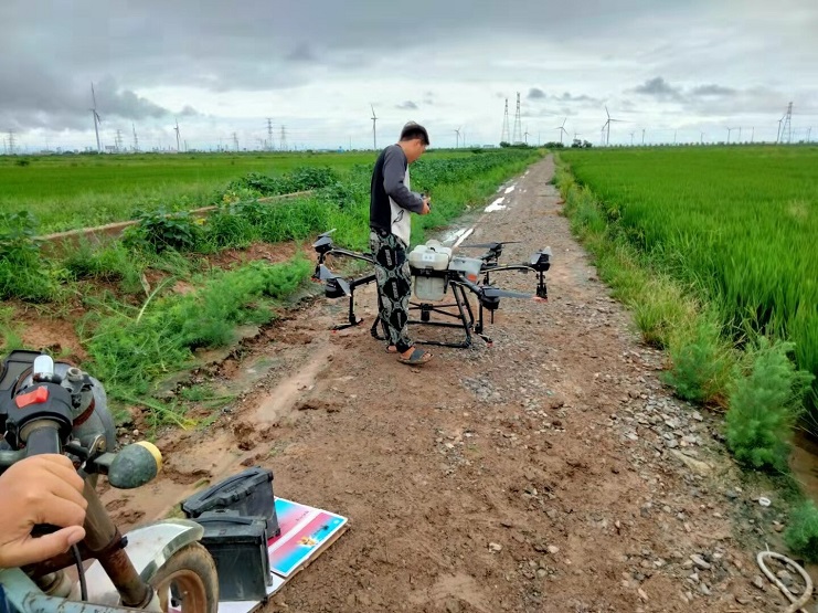 近日,明威公司農(nóng)田水稻進入齊穗期,是水稻形成產(chǎn)量的關(guān)鍵時期,為切實做好水稻該期病蟲害的防治工作,明威公司組織員工在下雨間隙,用一臺無人機,對二灣種植區(qū)的稻田噴施除蟲農(nóng)藥——齊穗藥,以增強水稻對病蟲害的防控能力。