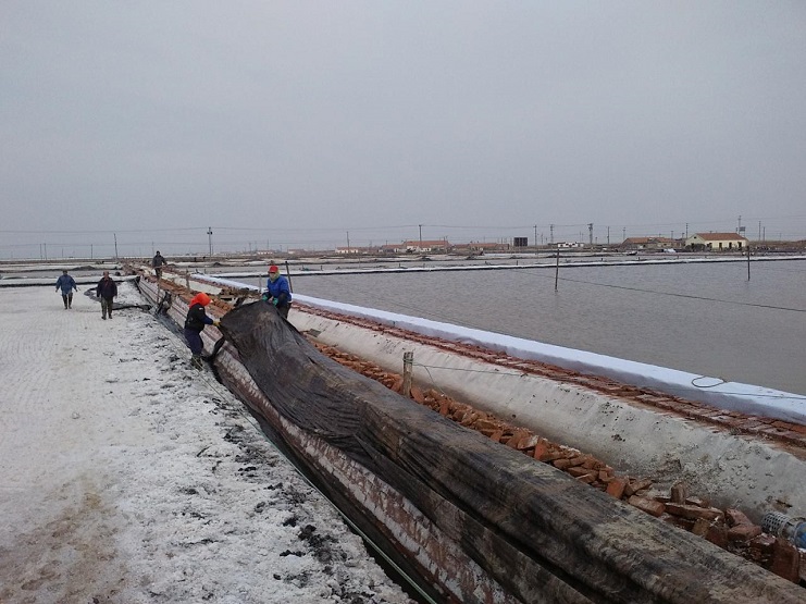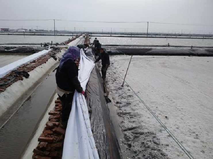 新河制鹽分公司為了盡快改善食用鹽基地面貌,減少池埝上固化紅磚風(fēng)化,沙塵落入鹽池內(nèi),對池鹽的污染,近期組織分公司職工,對基地塑池的紅磚固化池埝進(jìn)行處理,先用黑塑布把池埝重包一遍,然后再用土工布苫好。有效地減少了雜物落入池鹽中,為產(chǎn)合格食用鹽提供了良好生產(chǎn)環(huán)境。(圖為職工們正在苫蓋紅磚固化池埝。)