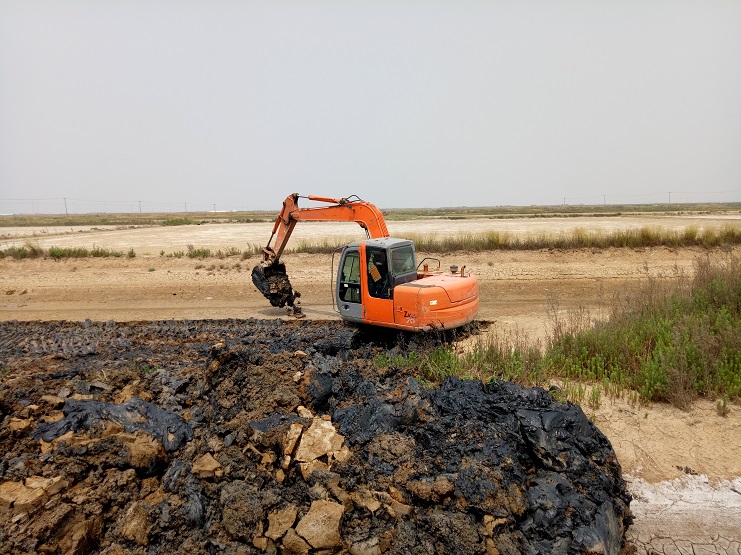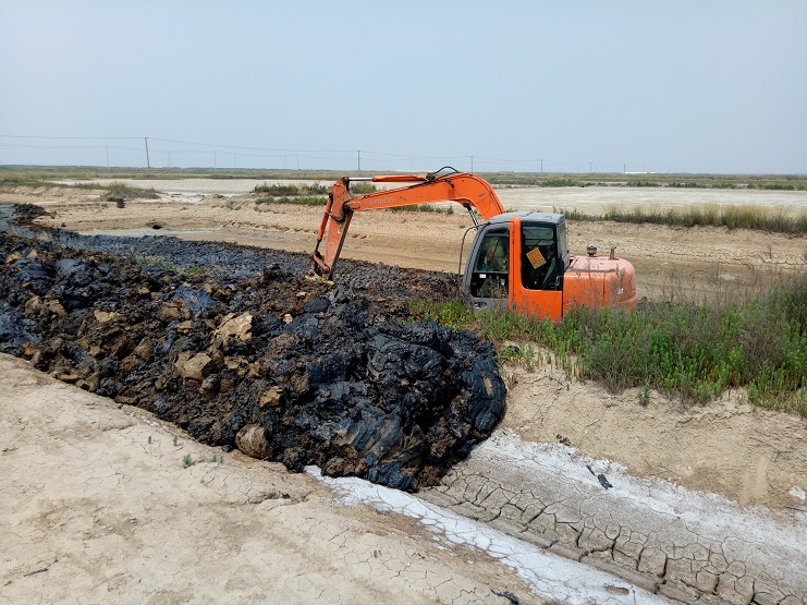 海鹽基地一班班組近日對土塘進行清淤改造。兩臺挖掘機頂著連日來的高溫天氣連續(xù)工作。現(xiàn)該班班組的三排土塘清淤改造工作基本完成。(實業(yè)公司)