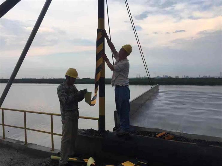 隨著碼頭裝卸業(yè)務(wù)愈加的繁忙,宵洋物流公司全體員工也都沉浸在這樣的工作狀態(tài)中,為碼頭業(yè)務(wù)拓展舔磚加瓦。常言道“安全無小事”,宵洋碼頭在忙于日常業(yè)務(wù)開展的同時(shí),也在不斷的完善和落實(shí)碼頭場地上的安全保護(hù)措施,圖中為碼頭工人正在為場地內(nèi)的防護(hù)欄桿等貼上安全防護(hù)條。(宵洋張寶同)
