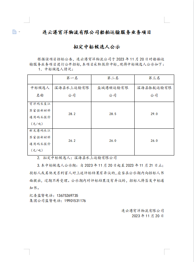 連云港宵洋物流有限公司船舶運輸服務(wù)業(yè)務(wù)項目擬定中標(biāo)候選人公示