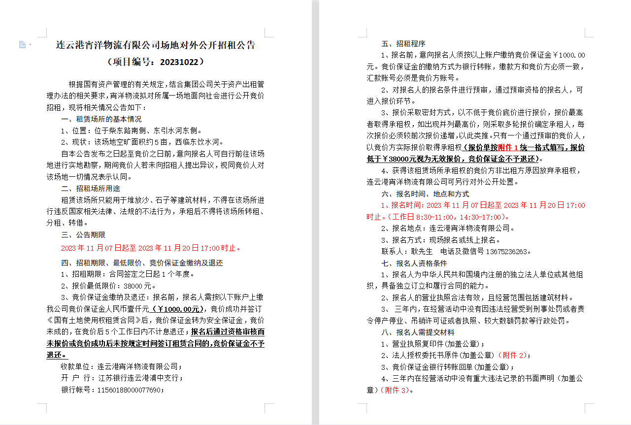 連云港宵洋物流有限公司場(chǎng)地對(duì)外公開(kāi)招租公告