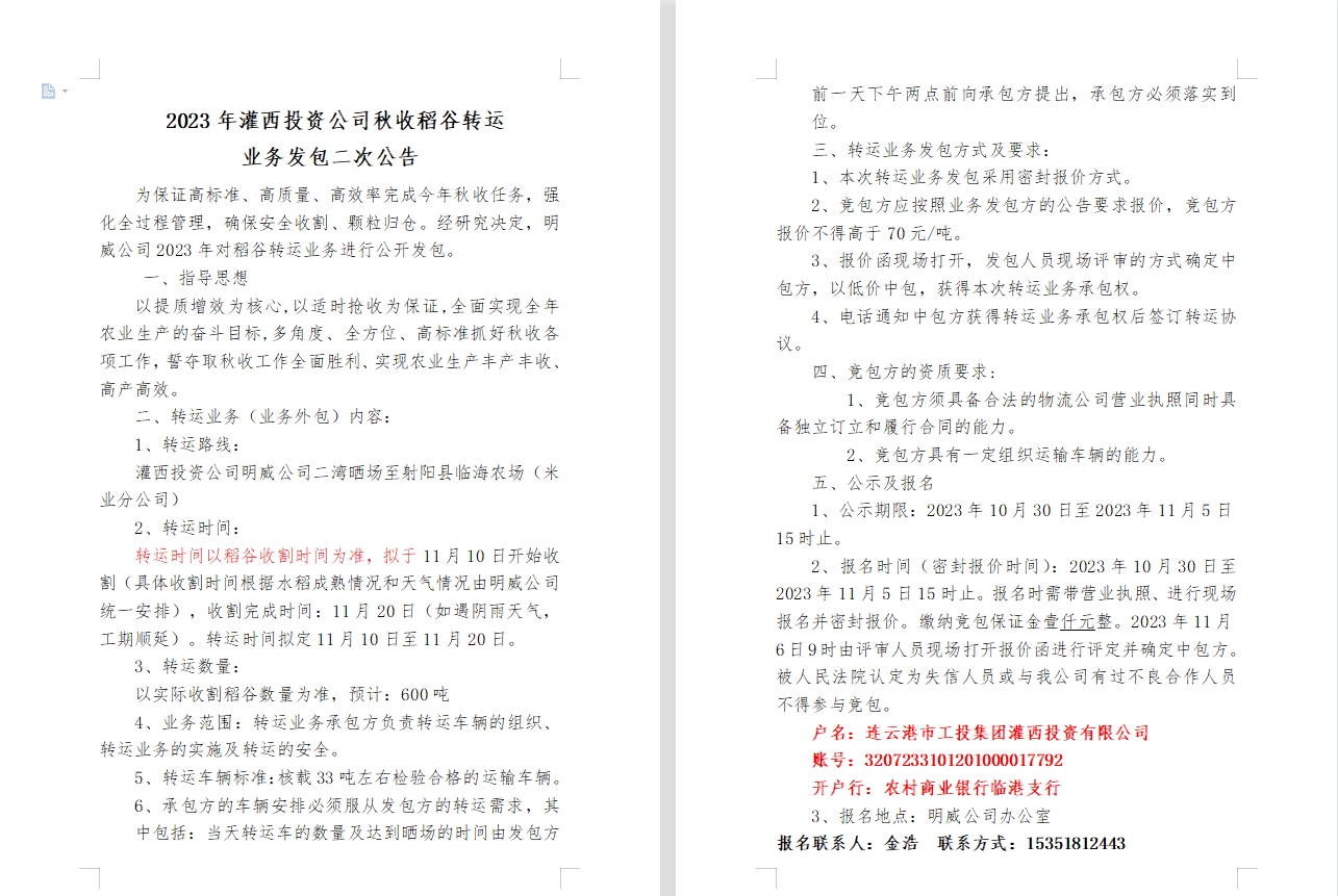 2023年灌西投資公司秋收稻谷轉運 業(yè)務發(fā)包二次公告