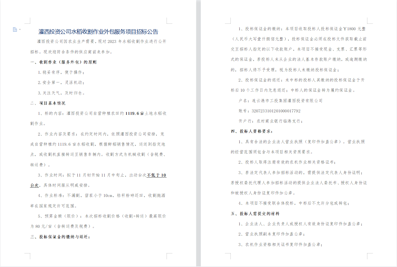 灌西投資公司水稻收割作業(yè)外包服務(wù)項(xiàng)目招標(biāo)公告