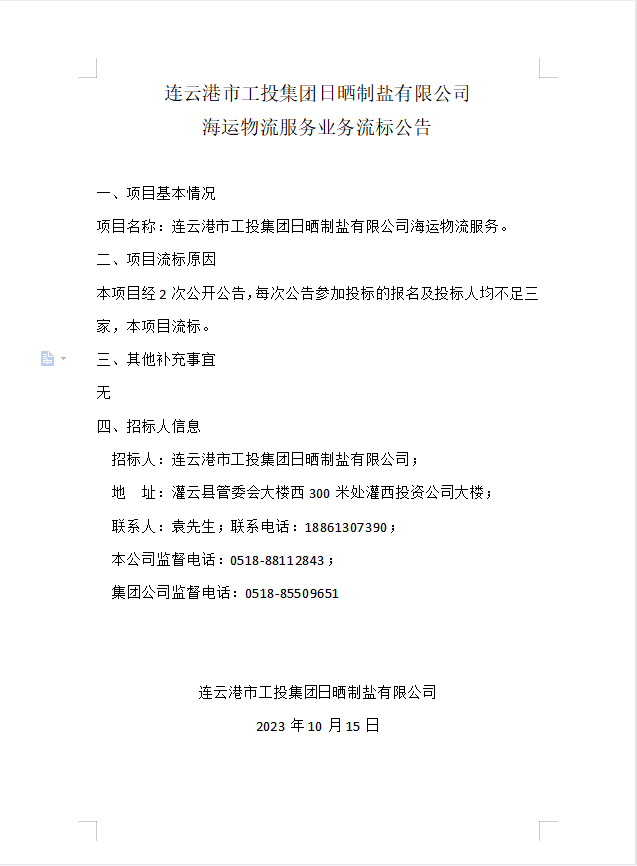 連云港市工投集團日曬制鹽有限公司海運物流服務(wù)業(yè)務(wù)流標公告