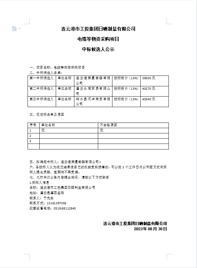 連云港市工投集團(tuán)日曬制鹽有限公司電纜等物資采購項目中標(biāo)候選人公示