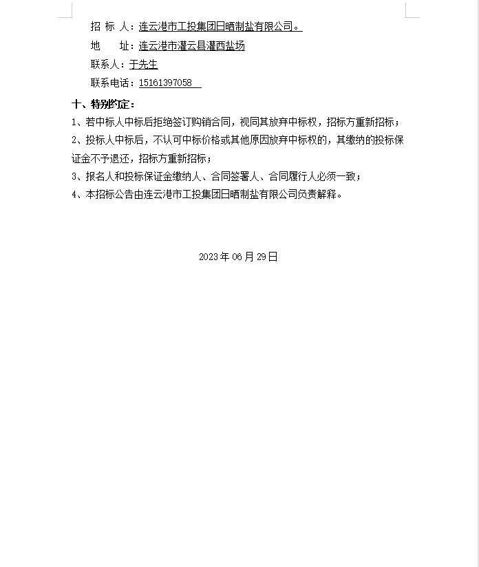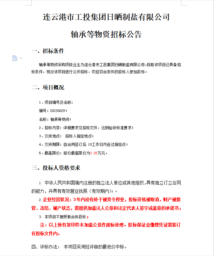連云港市工投集團(tuán)日曬制鹽有限公司軸承等物資招標(biāo)公告