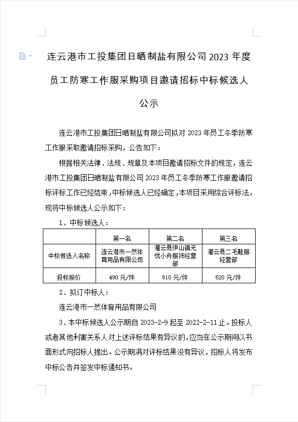 連云港市工投集團日曬制鹽有限公司2023年度員工防寒工作服采購項目邀請招標中標候選人公示