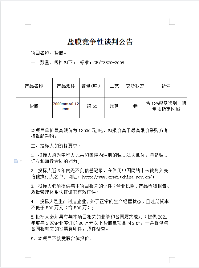 鹽膜競(jìng)爭(zhēng)性談判公告