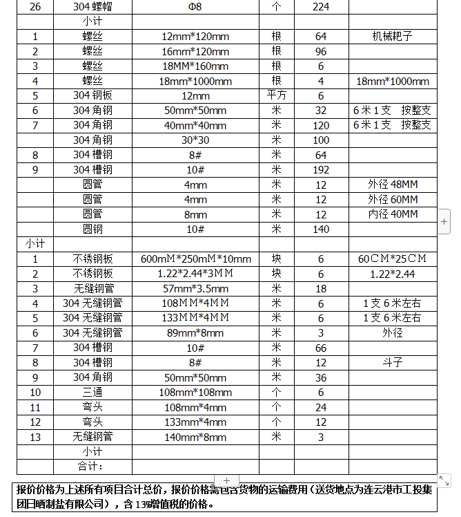 單價(含13%稅、運輸費用)。合同期間304不銹鋼單價不以304不銹鋼市場單價的變動而作任何調(diào)整。