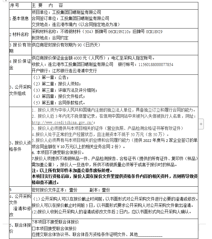 報價保證金接收人:連云港市工投集團日曬制鹽有限公司。