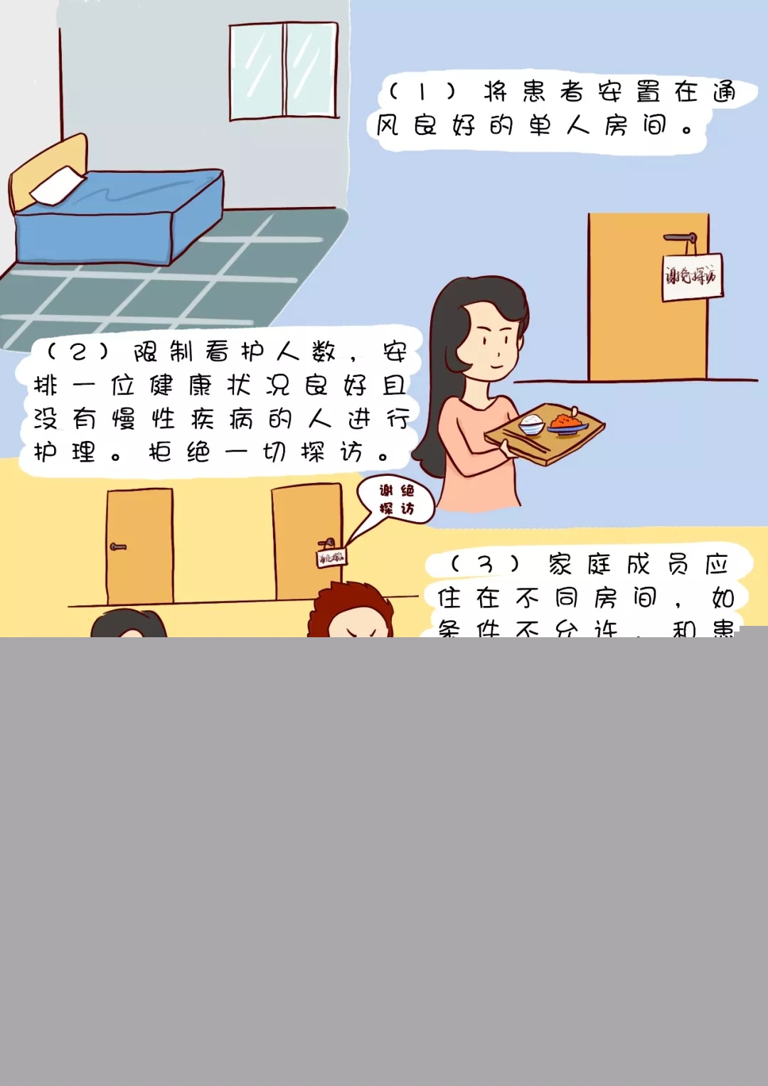 (2)限制看護(hù)人數(shù),盡量安排一位健康狀況良好且沒有慢性疾病的人進(jìn)行護(hù)理。拒絕一切探訪。