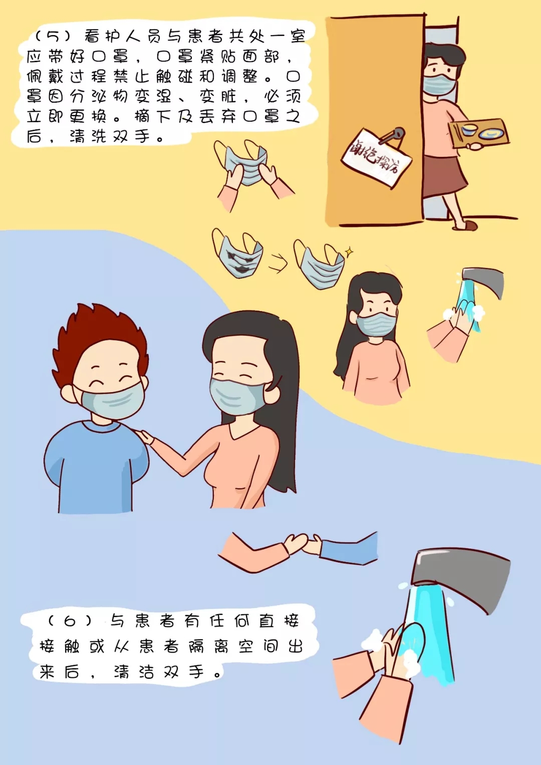 (5)看護(hù)人員與患者共處一室應(yīng)帶好口罩,口罩緊貼面部,佩戴過(guò)程禁止觸碰和調(diào)整。口罩因分泌物變濕、變臟,必須立即更換。摘下及丟棄口罩之后,清洗雙手。