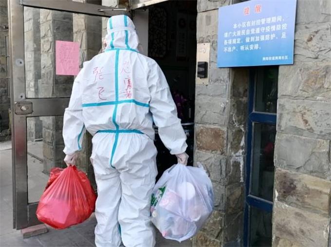 黨委工作部、工會干事張飛正在為社區(qū)居民配送生活必需品