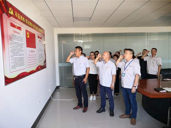 活動中,面對鮮紅的黨旗,公司黨支部副書記袁忠作為領誓人,帶領全體黨員一起高舉右手,再次莊嚴宣誓。鏗鏘恢宏的誓詞,強烈震撼著在場的每一位黨員,一字一句,神圣而豪邁,體現(xiàn)了黨員對中國共產黨的無限忠誠。