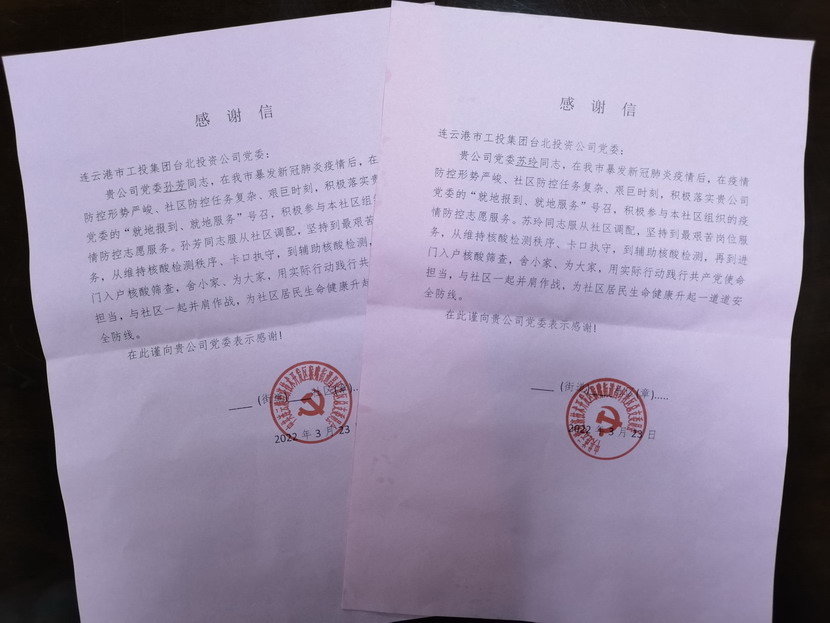 “臺北投資公司的黨員同志們視疫情防控為己任,服從調(diào)度安排,站好每一班崗,不僅認(rèn)真履行防控職責(zé),又創(chuàng)新開展疫情防控教育宣傳、便民服務(wù)等多項活動,成為我們社區(qū)防疫攻堅的主力軍。”3月25日,收到開發(fā)區(qū)猴嘴街道昌圩社區(qū)送來的一份特殊的“禮物”— 一封疫情防控感謝信,感謝臺北投資公司黨員蘇玲、孫芳等同志在新冠肺炎疫情防控的關(guān)鍵階段挺身而出、伸出援手,參與協(xié)助社區(qū)的疫情防控工作。