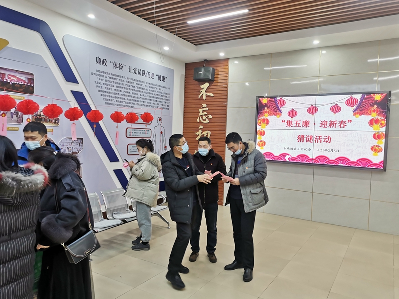 2月5日上午,臺北廉政文化教育室中人聲鼎沸,氣氛活躍,公司紀(jì)委“集五廉·迎新春”猜謎活動在干部職工中掀起一股節(jié)前廉政熱潮。