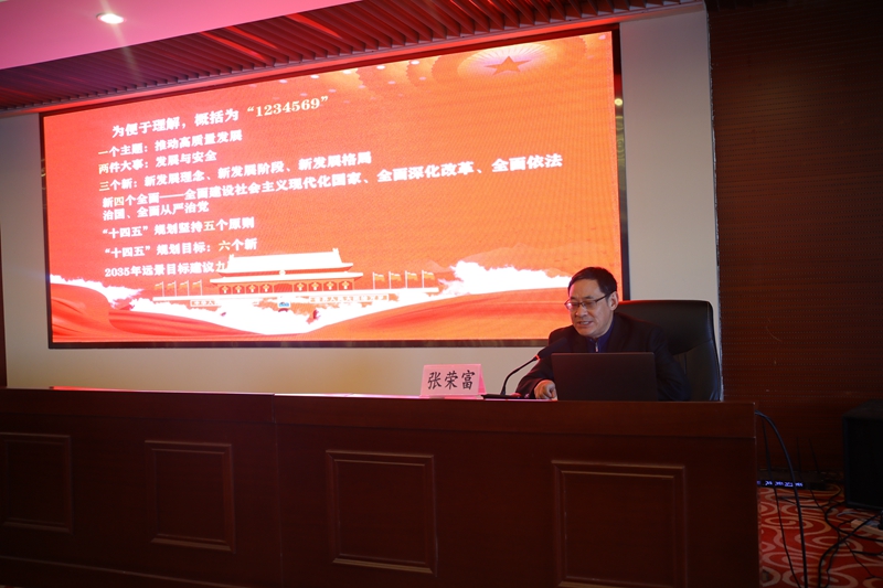 下半場,張校長從一個主題,推動高質(zhì)量發(fā)展;兩件大事,發(fā)展與安全;三個新,新發(fā)展理念、新發(fā)展階段、新發(fā)展格局;新四個全面,全面建設(shè)社會主義現(xiàn)代化國家、全面深化改革、全面依法治國、全面從嚴治黨;“十四五”規(guī)劃堅持五個原則;“十四五”規(guī)劃目標,六個新;2035年遠景目標建議九項措施等九個方面解讀了全會精神的“新征程 新理念 新格局 新愿景”。