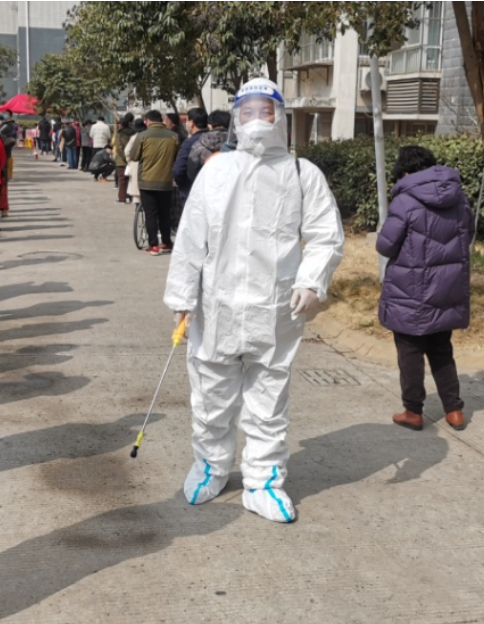 ? ?黨員尹永明,穿好防護服,帶上手套,口罩和防護眼鏡,背上30多斤的便攜式噴射器全身“武裝”,變成“大白”開始了一天的工作,從早上7點開始“打起精神努力干”到下午1:30“拖著疲憊的雙腿結(jié)束”。