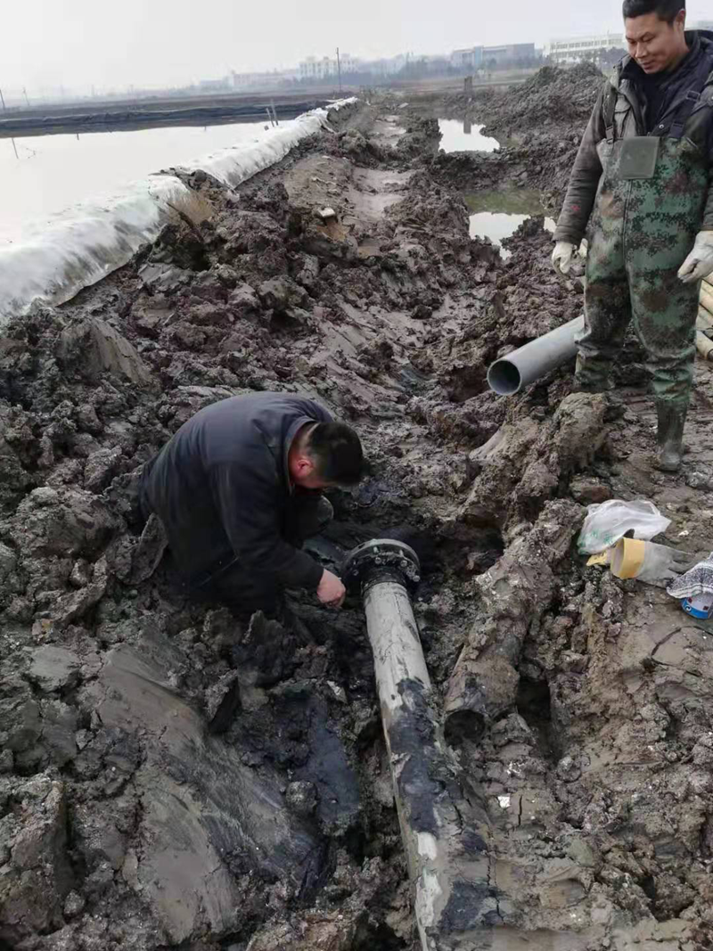該項工程是為了配合開發(fā)區(qū)新建道路正常施工,和保證大浦工區(qū)原鹽生產不受影響,由翔立分公司承接的猴嘴十二路下穿DN315和DN160兩根PE管道穿越工程。因規(guī)劃的穿越點處于水塘邊,現(xiàn)場施工環(huán)境較為困難。翔立公司參與施工人員想方設法克服困難,穿越施工前采取發(fā)電機水泵抽排水、填土夯實頂管機作業(yè)場地、克服淤泥深等障礙,保證施工進度的正常進行。