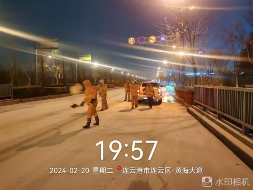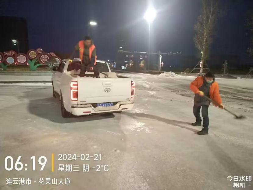 凌晨3點(diǎn),葛中仁、孫銀、薛興華、伏廣軍奮戰(zhàn)在花果山大道除雪現(xiàn)場(chǎng),由于冰凍嚴(yán)重、路面濕滑,工程車行進(jìn)過程中舉步維艱,他們互相配合、齊心協(xié)力,時(shí)刻關(guān)注路面情況,確保道路無積雪、無結(jié)冰。