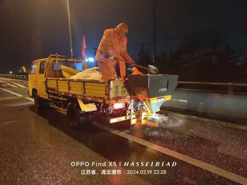 夜晚12點(diǎn),在佟圩路馬山立交,孫玉虎在工程車上一邊拋撒融雪劑一邊指揮:“融雪劑一定要撒布均勻,適當(dāng)擴(kuò)大距離,避免浪費(fèi)。”工程班金華、蘇志國、林軍、李林不停地在風(fēng)雪中揮舞著鐵锨,絲毫顧不上被風(fēng)雪擊打的面部疼痛。