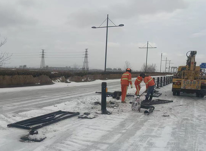 近兩日,因雨雪天氣,道路結(jié)冰濕滑,車輛行駛過程中發(fā)生意外,造成港前大道、海濱大道、228國道等地段發(fā)生多起道路護欄等設(shè)施損壞情況。收到信息后,市政分公司道路養(yǎng)護人員迅速反應(yīng),在班長孫寬成帶領(lǐng)下,隊員們頂風(fēng)冒雪第一時間趕赴現(xiàn)場。